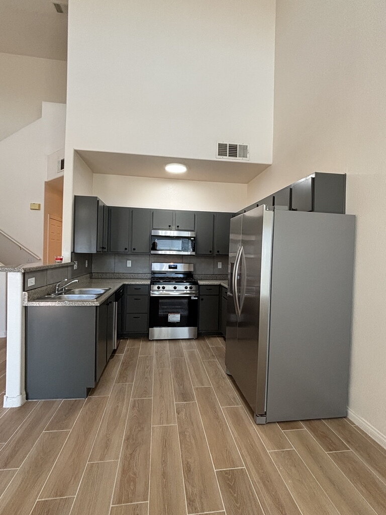 Small tucked away townhome style apartment located just off the 515 & Russell and snuggled against the hill with plenty of undeveloped land behind. This home features an open floorplan on the first floor, two story vaulted ceiling rooms in the living room and beautiful natural light throughout the day. Two bedrooms and two bathrooms; primary bedroom offers a large walk in closet. This home features a beautifully updated kitchen with brand-new stainless steel appliances, and the bathrooms have also been refreshed, including new sinks and toilets. This home has a large and private front patio as well. Attached two car garage with automatic garage opener. Beautiful community with a nice pool and just down the street from Stephanie Lynn Craig Park with Ball field, barbeques, picnic tables, playground and lots of green grass for your dogs & everyone to play. Only 3.5 miles from the Galleria Mall. Easy access to the 93/515 freeway. Living area 1100 sq.ft. Must apply on our website